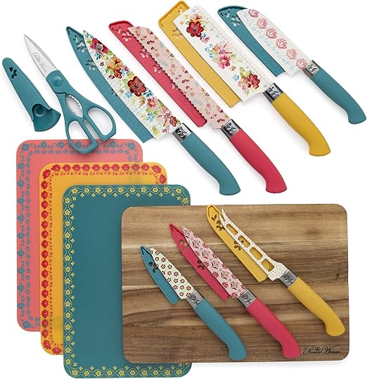 The set includes an 8 chef's knife with sheath, 7 santoku knife with sheath, 6 sandwich knife with sheath, 6 nakiri knife with sheath, 5 utility knife with sheath, 3.5 paring knife with sheath, kitchen shears, 2 spreader knives, wooden cutting board. That is down from the normal price of $69.97. This handsome rosewood handle knife set complements many kitchen decors. Walmart is cutting prices on kitchen essentials! Show off your impeccable chopping skills with this the pioneer woman cutlery set.